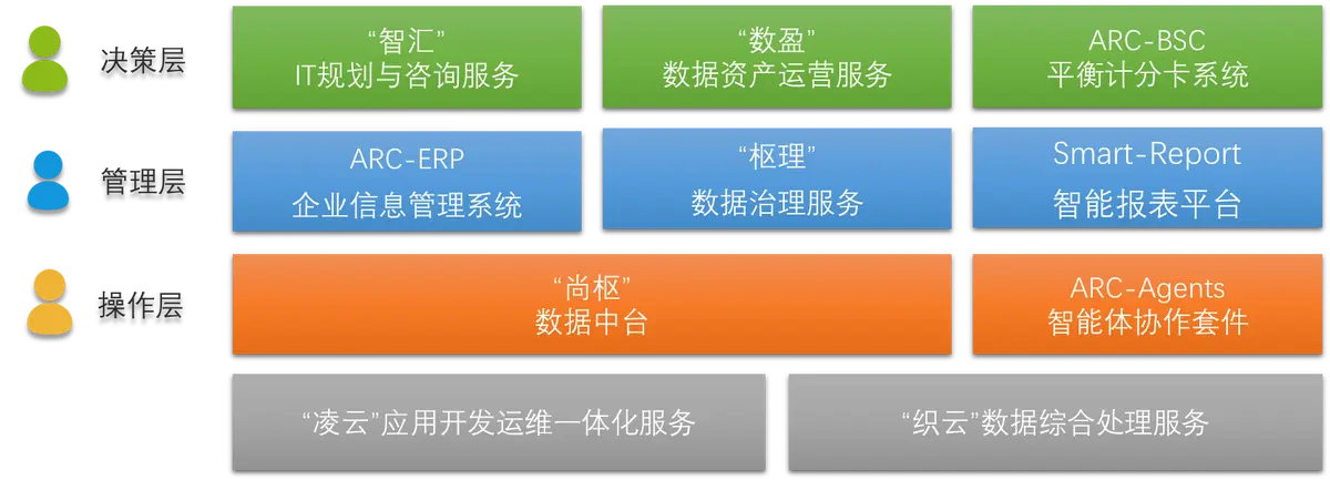 在決策層,“智匯”IT規(guī)劃與咨詢服務(wù),憑借專業(yè)團(tuán)隊對行業(yè)趨勢和技術(shù)生態(tài)的深度洞察,為企業(yè)量身定制契合發(fā)展戰(zhàn)略的IT架構(gòu)藍(lán)圖,明晰數(shù)字化路徑;“數(shù)盈”數(shù)據(jù)資產(chǎn)運營服務(wù),挖掘企業(yè)數(shù)據(jù)價值,將分散數(shù)據(jù)轉(zhuǎn)化為可運營、能創(chuàng)造效益的資產(chǎn),驅(qū)動業(yè)務(wù)創(chuàng)新;ARC - BSC平衡計分卡系統(tǒng),以戰(zhàn)略為導(dǎo)向,從財務(wù)、客戶、內(nèi)部流程、學(xué)習(xí)與成長等維度,量化指標(biāo)、監(jiān)控進(jìn)度,助力科學(xué)決策 。